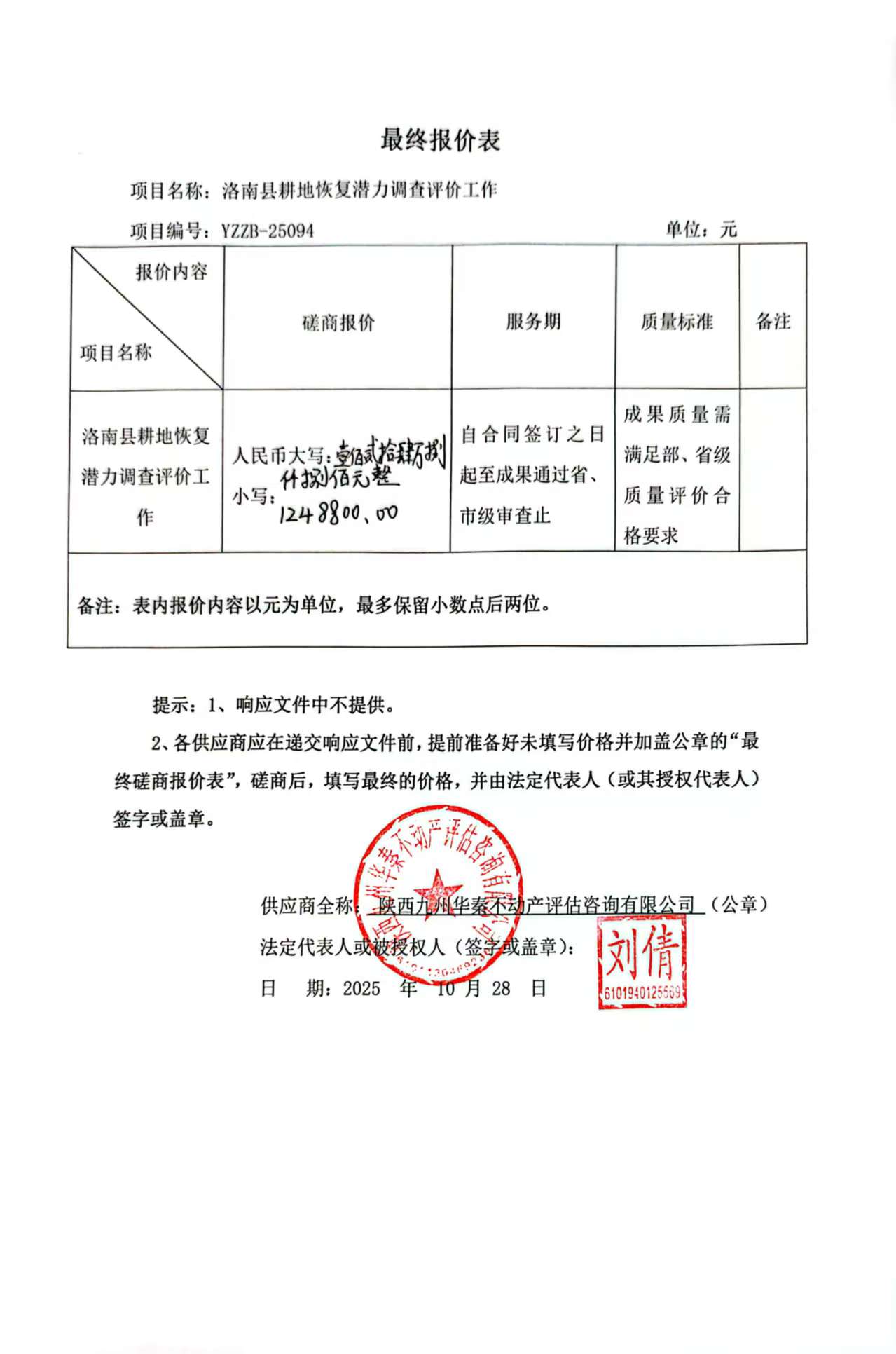 ******资源局洛南县耕地恢复潜力调查评价工作中标(成交)明细.pdf 洛南县耕地恢复潜力调查评价工作--竞争性磋商文件25.10.09.pdf 九州华秦中小企业声明函-潜力调查.pdf 最终报价表.jpg