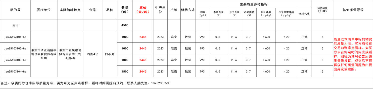 质量:公告中提供的质量指标由委托单位提供,仅供参考。竞购方须到库点看样(看样时间需提前预约,联系人熊先生: ******),以确保对质量及保管状况有充分了解。如竞购方未进行看样,则在成交后应自觉履行各项义务,且不得以质量问题为由提出异议或申请商务处理。