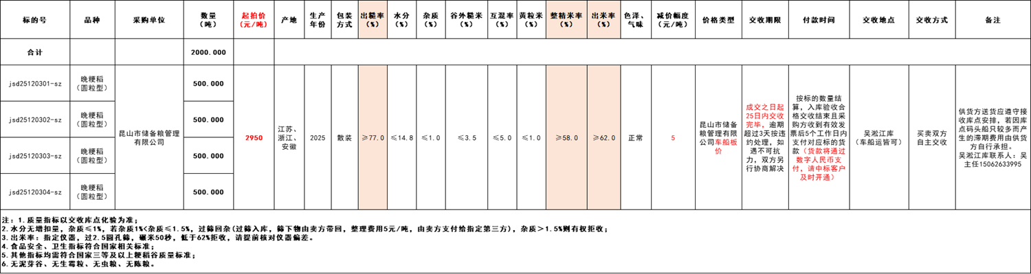 受******有限公司委托, 江苏粮油商品交易市场暨苏州分市场定于2025年12月3日 9:45在“江苏地方粮食采购交易专场”举办本次粳稻竞价采购交易活动。具体事宜公告如下: