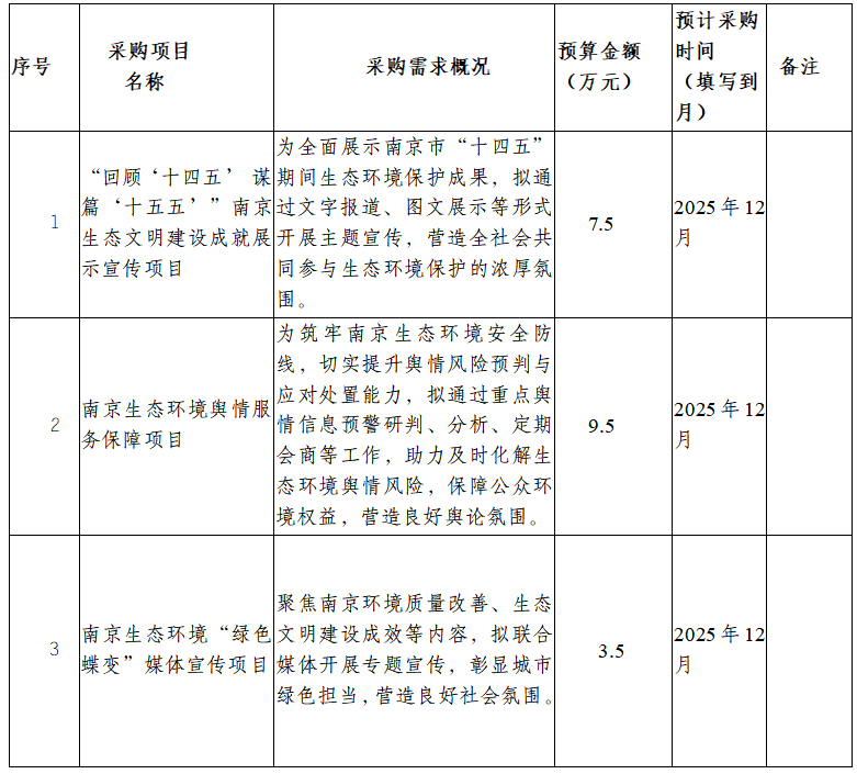 | 信息名称: | 南京市生态环境保护宣传教育中心2025年12月政府采购意向公告 | ||