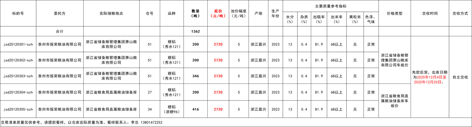 五、交割事项:买卖双方自主交收,中标方成交后凭合同和身份证明带款或有效汇款凭证到委托方提货(双方自行承担资金安全责任,自行采取有效措施防范交割风险),买卖双方凭确认单到交易市场退保证金(保证金待合同履约结束后统一释放)。出库日期为2025年12月4日至2025年12月20日。标书各项质量指标由委托单位提供,仅供参考,质量以仓库大样为准,买方一旦成交,不得提出异议。因开仓后不能按时提货导致的粮食品质下降由买方自行承担。