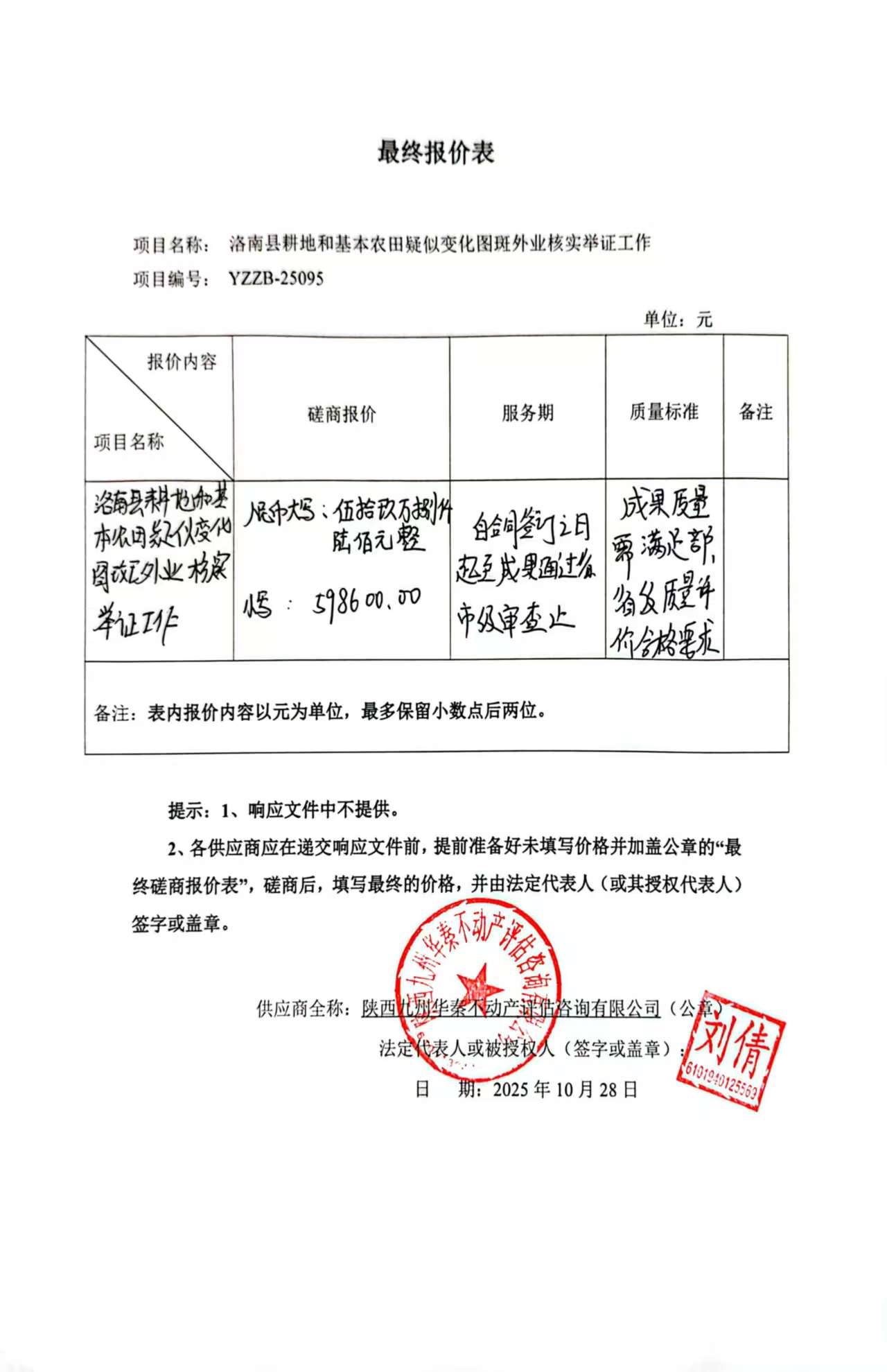 ******资源局洛南县耕地和基本农田疑似变化图斑外业核实举证工作中标(成交)明细.pdf 洛南县耕地和基本农田疑似变化图斑外业核实举证工作-竞争性磋商文件25.10.09.pdf 九州华秦中小企业声明函-耕地与基本农田.pdf 最终报价表.jpg