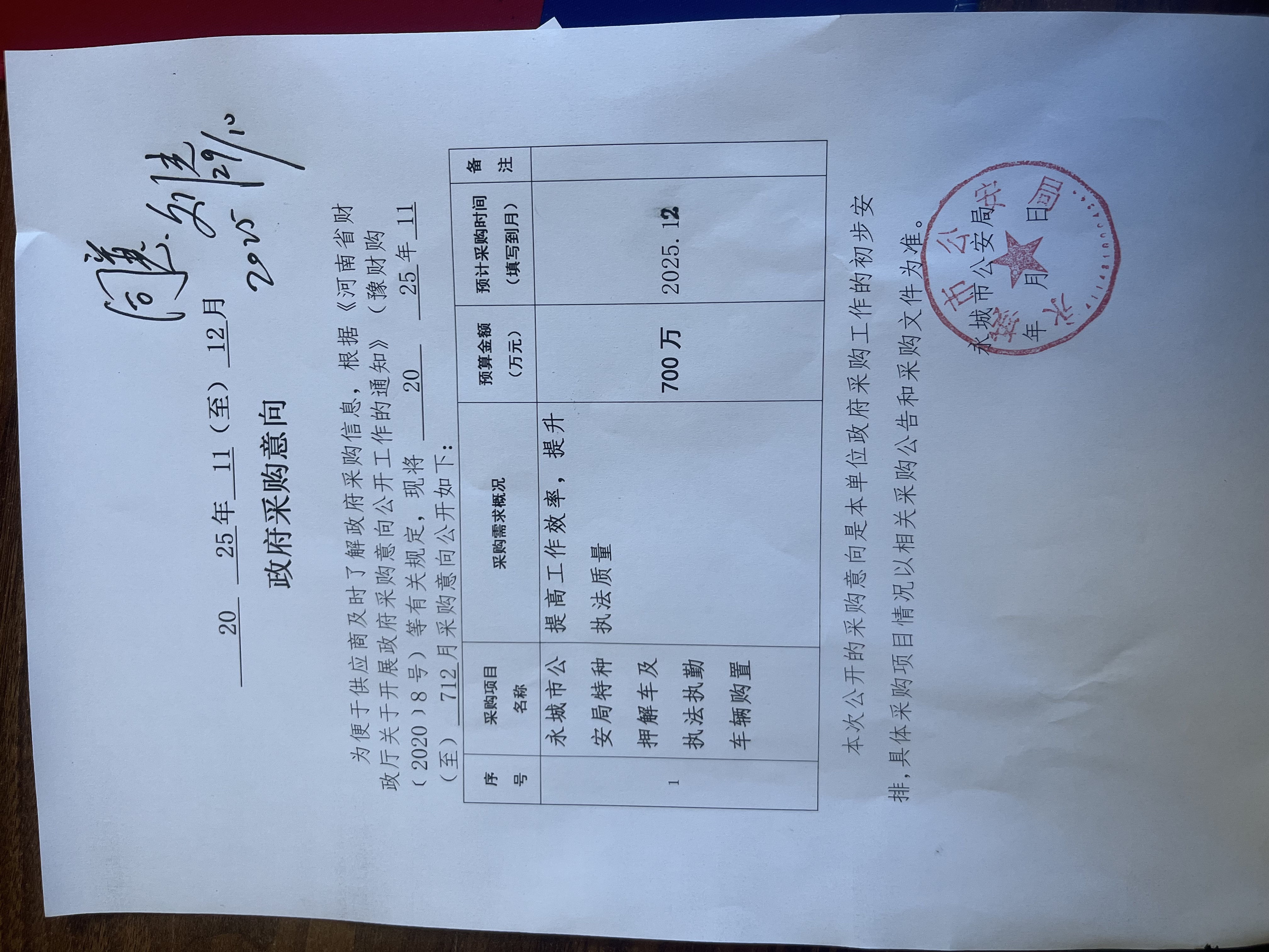 为便于供应商及时了解政府采购信息,根据《******公安局 2025年11(至)12月采购意向公开如下: